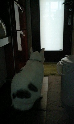 母に頼まれて組み立て家具を勝手口の外で組み立てていたら、カンちゃんがすぐドアの内側で待っていました。